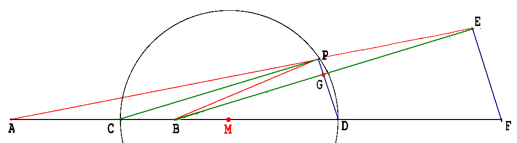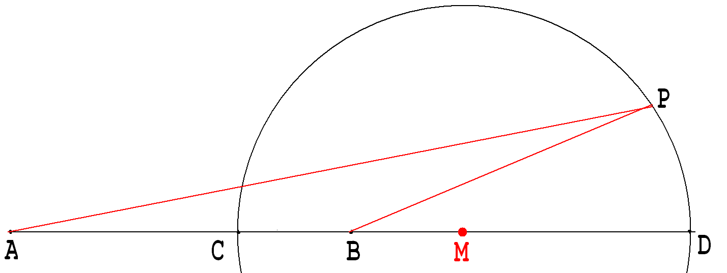 Eine Strecke [AB] sei durch die Punkte C und D innen und außen im gleichen Verhältnis geteilt. Durch C und D verlaufe ein Kreis, dessen Mittelpunkt M zwischen C und D liegt.