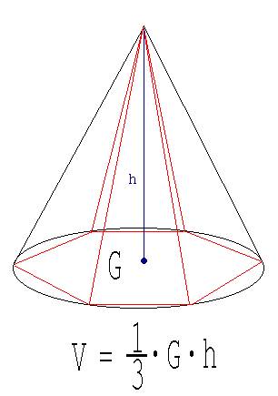 Einem Kegel der Höhe h und der Grundfläche G kann eine Pyramide einbeschrieben werden. Durch Vergrößerung der Eckenzahl erreicht man eine bessere Anpassung der Pyramide an den Kegel. Das Volumen einer einbeschriebenen Pyramide strebt mit wachsender Eckenzahl gegen das Produkt V :