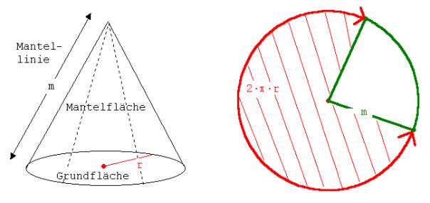 Wenn man den Kegelmantel mit Papier belegt und dieses Papier anschließend auf einer Ebene ausbreitet, dann erhält man einen Kreissektor (rot schraffierte Fläche).