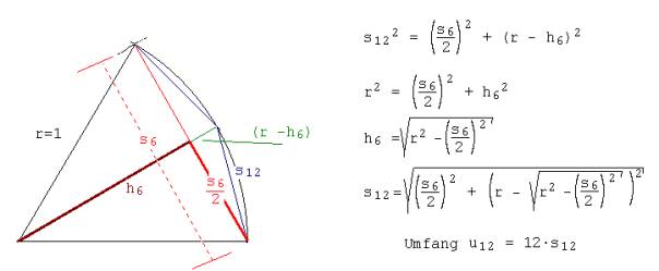 Zur Berechnung von s24 muss in der für s12 gültigen Formel s12 durch s24 und s6 durch s12 ersetzt werden. In gleicher Weise kann dann auch das 48-, 96-Eck usw. berechnet werden.