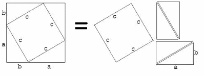 Vier rechtwinklige Dreiecke mit den Katheten a und b werden zu einem Quadrat zusammengestellt. Das Bild gibt sofort zu erkennen: (a+b)2 = c2 + 2·a·b → a2 + b2 = c2 .