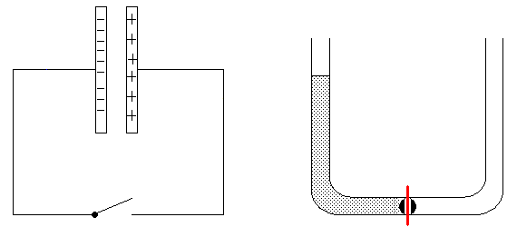 In der Abb.3.1 sind zwei Gegenstände zum Vergleich dargestellt. Links ist ein geladener Plattenkondensator skizziert, dessen Platten über einen geöffneten Schalter miteinander verbunden sind. Rechts ist ein U-Rohr zu sehen, dessen Schenkel durch einen zunächst geschlossenen Hahn getrennt sind. Der eine Schenkel ist mit Wasser gefüllt. Wird der Hahn geöffnet, dann schwingt das Wasser von einem Schenkel zum anderen und zurück.