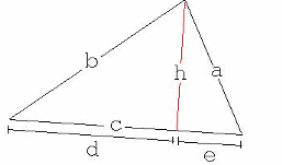 b, a und c werden durch die Variablen h, d und e ausgedrückt und danach bewiesen, dass s·(s-a)·(s-b)·(s-c) den gleichen Wert liefert wie die für A2 gültige Gleichung A2 = h2 · (d+e)2 / 4