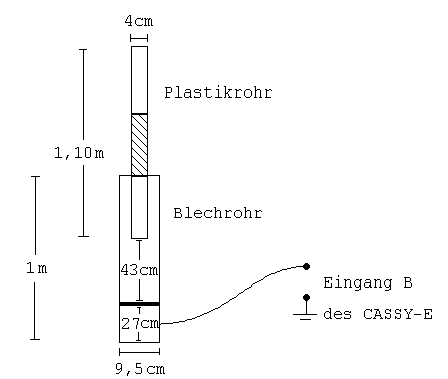 Ein Plastikrohr wird zunächst durch gleichmäßiges Reiben mit einem Stück Papier elektrisch aufgeladen (eine starke Ladung ist nicht erwünscht ). Dieses Rohr läßt man in einem Blechrohr ( verzinktes Regenabflußrohr ) fallen, wobei aus dem Blechrohr negative Ladung verdrängt wird (Influenz), deren Menge dem Fallweg proportional ist. Die abfließende Ladung (Integral der Spannung/R ) wird mit Hilfe eines AD-Wandlers (CASSY-E oder PC-10/20 ) in Verbindung mit dem Meßprogramm „MAUS" gemessen. Die 43 cm lange Fallstrecke beginnt im Blechrohr 30 cm unterhalb der oberen Rohröffnung . In diesem Fall wirkt sich das inhomogene elektrische Feld am Anfang des Stabes nicht in unerwünschter Weise auf den Verlauf des Diagramms aus.
