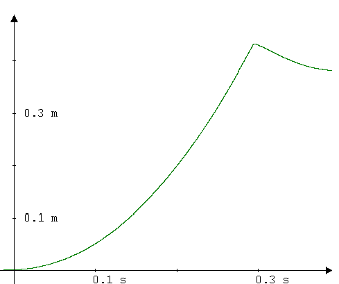 Aus dem mit 4s Meßzeit aufgenommene Diagramm wird der zum Fall gehörende Teil mit dem Unterprogramm „Kurve erneut zeichnen oder Meßdiagramm dehnen" unter „Koordinaten" vergrößert. Es entsteht das Diagramm in Abb. 2. Bevor das in Abb. 2 sichtbare Koordinatensystem gesetzt werden kann, muß das Bildfeld passend kalibriert werden. Nach Anklicken von „Kalibrieren in y-Richtung" unter „Koordinaten" wird der Scheitel und die zum Aufschlag gehörende Stelle des Diagramms angeklickt. Nach der Frage über den zugehörenden Unterschied der y-Werte wird 43 cm angegeben.