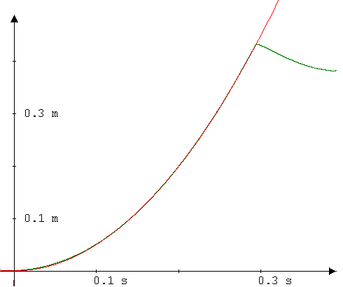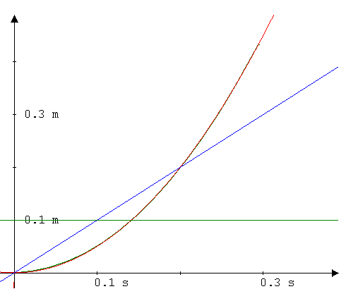 Abb. 3 zeigt das Diagramm mit einer roten Parabel, die dem Diagramm mit Hilfe des Unterprogramms „Polynome" unter „Mathematik" angepaßt wurde. Es ist zu sehen, daß die Parabel hervorragen auf das Meßdiagramm paßt. Durch Differentiation der Parabelfunktion entsteht neben dem t-s-Diagramm noch ein t-v- und ein t-a-Diagramm (siehe Abb. 4). Die Werte zu dem t-v-Diagramm und dem t-a-Diagramm in Abb. 4 sind um den Faktor 0,1 bzw. 0,01 verkleinert.