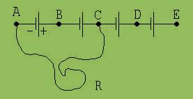 In Abb. 1 sind 4 in Reihe geschaltete elektrochemische Elemente abgebildet. R ist ein dünner, langer Metalldraht. Wird sein rechtes Ende nach und nach von B nach C, dann von C nach D und schließlich von D nach E verlegt, dann ist zu erkennen, dass die Stärke des in ihm fließenden elektrischen Stroms proportional der Zahl der elektrochemischen Elemente zwischen den Enden des Drahtes ist.