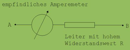 Der Widerstandswert des in der Abb. 4 angedeuteten Leiters muss sehr groß gewählt werden, damit der Stromfluss durch das Amperemeter keine nennenswerte Änderung der Spannung U bewirkt.