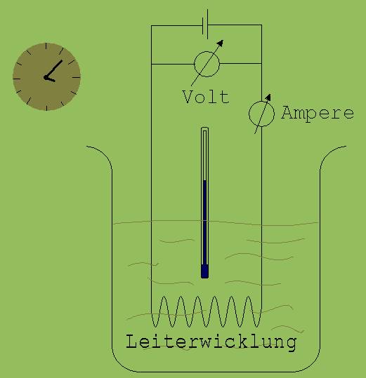 Die Elektronen stoßen auf Atome des Leiters und geben so ihre gewonnene kinetische Energie immer wieder an die Atome des Leiters ab. Die Zunahme an Bewegungsenergie bei den Atomen des Leitermaterials macht sich am Leiter als Temperaturanstieg bemerkbar. Taucht der Leiter in Wasser, dann geben seine Atome ihre beim Zusammenstoß mit Elektronen gewonnene Energie fast vollständig an die Atome des umgebenden Wassers ab. Mit der in Abb. 1 dargestellten Anordnung kann diese Energie gemessen werden.