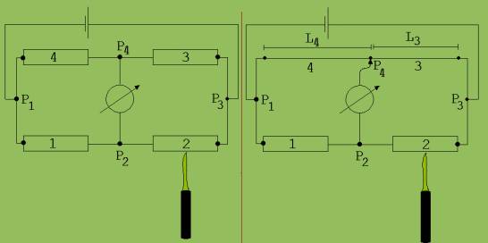 Der Widerstand des Leiters 2 nimmt zu. Ein Teil der durch 1 fließenden Elektronen zieht den Leiter 3 wegen seines geringeren Widerstandes dem Leiter 2 vor und nimmt den Weg über das Messgerät (Amperemeter). Da der Ausschlag des Messgeräts mit steigender Temperatur zunimmt, kann das Amperemeter zur Temperaturmessung kalibriert werden ( zu den Ausschlägen werden die zugehörenden Temperaturänderungen geschrieben). Es ist nicht ganz einfach, 4 Leiter mit gleichem Widerstandswerten für eine solche Anordnung zu finden bzw. herzustellen. Zur Vermeidung solcher Schwierigkeiten werden die beiden Drahtwicklungen 3 und 4 durch einen einzigen Draht D mit hohem Widerstand ersetzt (siehe Abb. 1 rechts). Der Anschluss P4 des Messgeräts am Draht D ist als Schleifkontakt ausgebildet. Er kann so verschoben werden, dass kein Strom durch das Messgerät fließt. Dies ist dann der Fall wenn folgende Bedingung erfüllt ist: