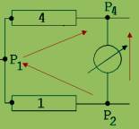 Wenn das Amperemeter keinen Strom anzeigt, dann ist die Spannung zwischen P2 und P4 gleich 0. Hieraus folgt, dass die Spannungen über den Leitern 1 und 4 gleich sind. Zur Begründung dieser Behauptung muss daran erinnert werden, dass die Spannung zwischen zwei Punkten gleich der Arbeit ist, welche das elektrische Feld verrichtet, wenn +1 Coulomb von einem Punkt zum anderen verschoben wird. Diese Verschiebearbeit ist nur vom Anfangs- und Endpunkt des Verschiebewegs und nicht von seinem Verlauf abhängig. +1 Coulomb wird gedanklich in zwei Schritten von P2 nach P4 verschoben: Zunächst wird die Ladung von P2 nach P1 gebracht (siehe Abb. 2), wobei das elektrischen Feld die Arbeit W verrichtet. Hiernach erfolgt der Transport von P1 nach P4 mit einer Arbeit W’ gegen das elektrische Feld. W’ gleicht der Arbeit des Feldes bei einer Verschiebung von P4 nach P1. Da die gesamte Arbeit gleich Null ist folgt: W = W’