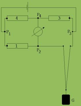Der elektrische Widerstand eines Drahtes nimmt nicht nur bei Erwärmung sondern auch bei einer Dehnung zu. In Abb. 3 ist eine Anordnung zu sehen, in der ein durchhängender Draht aus Konstantan anstelle der Leiterwicklung 2 eingesetzt ist. Wird dieser Draht mit einem Gewicht G belastet, dann schlägt der Zeiger des Messinstruments aus. Diese Anordnung kann zur Kraftmessung kalibriert werden. Konstantan wird für Kraftmessungen genommen, weil sein Widerstand kaum temperaturabhängig ist. Wäre dies nicht der Fall, dann würden durch Temperaturänderung Kräfte vorgetäuscht. Die Ursache für die Zunahme des elektrischen Widerstands sind die geometrischen Änderungen, die unter Belastung stattfinden. Der Draht wird länger und dünner. Der Widerstand eines Drahtes nimmt mit seiner Länge zu und mit wachsendem Querschnitt ab.