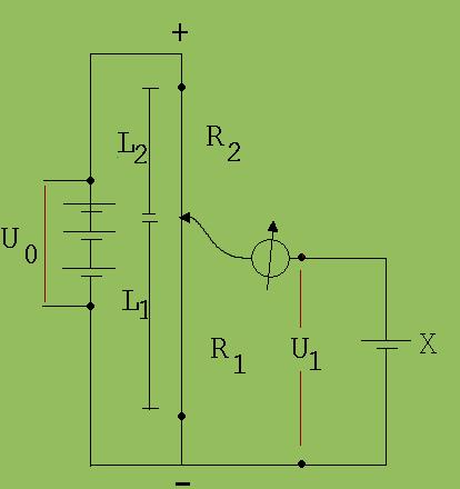 Zu Abb.3: Nimmt man statt der beiden Leiter 1 und 2 einen einzigen Draht der Länge L mit Schleifkontakt (siehe Abb. 3), dann können die Widerstandswerte durch die entsprechenden Leiterlängen ersetzt werden, denn die Widerstände verhalten sich zueinander wie die Leiterlängen.