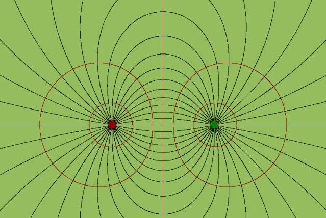Eine Äquipotenziallinie ist eine Linie, welche Punkte mit gleichem Potential verbindet. Die roten Kurven in Abb. 3 sind Äquipotenziallinien im Feld einer positiven und einer negativen Ladung Q. Die Äquipotenziallinien verlaufen senkrecht zu den Kraftlinien.