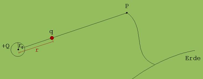 Zur Berechnung des Potenzials φK wird in Gedanken folgendermaßen vorgegangen. Eine positive, kleine Ladung q wird von der Oberfläche der geladenen Kugel zu einem weit entfernten Punkt P mit der Arbeit W1 verschoben. Von dort wird sie durch einen fast feldfreien Raum zur Erde gebracht ( W2 ≈ 0). Die Spannung der Kugeloberfläche in Bezug auf P ist gleich dem Potenzial.