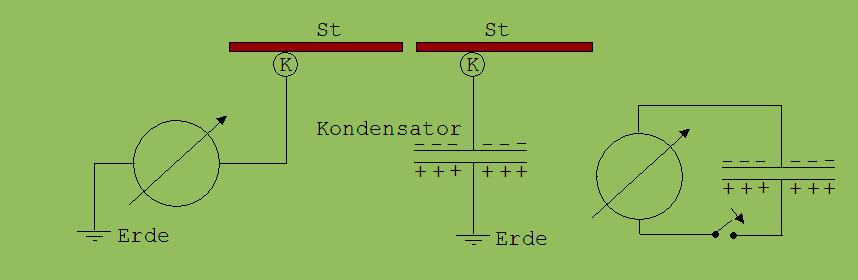 Es muss zunächst einmal festgestellt werden, dass der Ausschlag nur dann etwas über das Ausmaß der Ladung aussagen kann, wenn die Ladung nicht unregelmäßig, sondern schlagartig über das Amperemeter abgeführt wird. Dies ist aber mit der Ladung auf einem PVC-Stab nicht möglich. Die Ladung des Stabes St muss deshalb zunächst auf ein Gebilde übertragen werden, welches diese Ladung spontan abgeben kann. Die Übertragung auf einen Kondensator ist zu empfehlen (siehe Abb. 2). Bei einem solchen Kondensator kann es sich um ein durch Isolierfolien getrenntes Metallfolienpaar, welches zu einem Zylinder gewickelt ist (Folienkondensator) oder um zwei parallele voneinander getrennte Metallplatten handeln. Ein solcher Kondensator dient zur Speicherung unterschiedlicher Ladungen. Auf ihm halten sich diese infolge ihrer Anziehungskräfte gegenseitig fest. Als Symbol für einen Kondensator dient in jedem Fall ein Paar paralleler Strecken. Wird die obere Elektrode des in Abb.2 sichtbaren Kondensators (Platte oder Metallfolie) negativ aufgeladen, dann fließt unter der von dieser Ladung ausgehenden Kraft eine gleich große negative Ladung von der unteren Elektrode zur Erde. Die untere Elektrode ist hiernach positiv geladen.