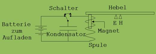 Zur Messung einer Kondensatorladung wählen wir eine Messanordnung, wie sie in der Abb. 4 dargestellt ist. Am Ende eines Hebels, der auf den Schienen E und H der Wippe aufliegt, ist ein Magnet befestigt, der in eine Spule mit 20000 Windungen eintaucht. Spule und Hebel bilden ein träge reagierendes Anzeigerät für elektrische Ströme (ballistisches Galvanometer). Die Abbildung zeigt folgendes Experiment: Ein Kondensator wird mit einer Batterie aufgeladen und anschließend über die Spule entladen, wobei der Hebel zu einer gedämpften Schwingung ausschlägt.