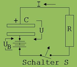 Nach der Definition der Kapazität C = Q/U gilt für die Spannung zwischen den Kondensatoranschlüssen: U = Q/C. Nach dem Schließen des Schalters S fließt ein Strom der Stärke I nach Q/C = I· R → I = Q/ (C· R) und vermindert in der kleinen Zeitabschnitts Δt die Ladung Q um ΔQ = I·Δt = Q/(C·R)·Δt. Δt ist so klein gewählt, dass sich die Stromstärke in dieser Zeit kaum verändert. Die Ladung zu Beginn von Δt wird mit Q und die am Ende mit Q’ bezeichnet.