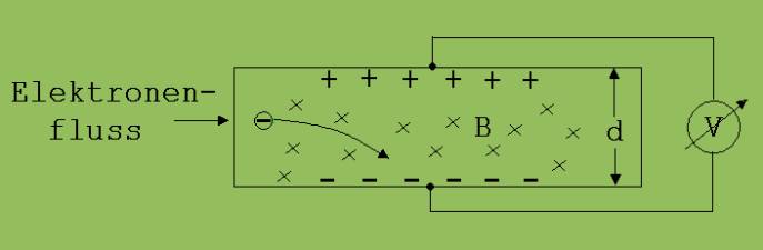 Da die von links nach rechts treibenden Elektronen vom Magnetfeld unter der Lorentzkraft nach unten abgelenkt werden, wird die Unterseite des Leiterbandes gegenüber der Oberseite negativ aufgeladen. Dieser Aufladungsvorgang ist beendet, wenn das hiermit entstehende elektrische Querfeld die verschiebende Wirkung des Magnetfeldes aufhebt.