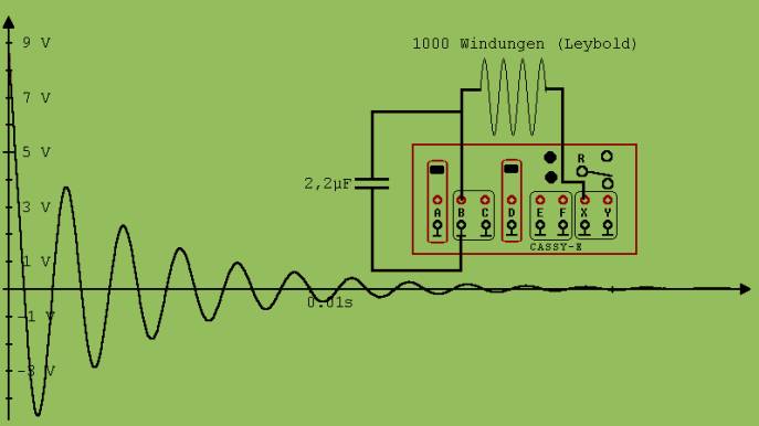 Zum Nachweis einer elektrischen Schwingung wird der oben skizzierte Versuch mit dem ADA- Wandler CASSY-E ( Leybold) durchgeführt. Das Messprogramm „MAuS“ veranlasst eine Spannung von 9 V am Ausgang X des CASSY, was zu einer Aufladung des 2,2 μF-Kondensators führt. Anschließend setzt es die Spannung am X-Ausgang auf 0. Dies wirkt sich wie ein Kurzschluss des x-Ausgangs aus. Die Kondensatorladung schwingt daraufhin durch die Spule zwischen den beiden Kondensatorelektroden hin und her. Die der Ladung proportionale Kondensatorspannung liegt am Messeingang B des CASSY. Sie wird vom Rechner in Abhängigkeit von der Zeit dargestellt. Das Diagramm (siehe Abb.3) zeigt eine gedämpfte elektrische Schwingung.