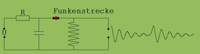 Abb. 4 zeigt eine Anordnung, die in der Entdeckungszeit elektrischer Schwingungen zum Experimentieren genutzt wurde. Ein Kondensator wird über einen Widerstand R unter einer hohen Spannung U aufgeladen. Bei einer bestimmten Kondensatorspannung wird ein Funken zwischen zwei Kontakten gebildet. Die dabei entstehenden Gasionen machen die Funkenstrecke zu einer leitfähigen Verbindung zwischen den beiden Kondensatoranschlüssen. Es bildet sich eine gedämpfte Schwingung aus. Nach dem Abklingen setzt die nächste Schwingung ein usw..