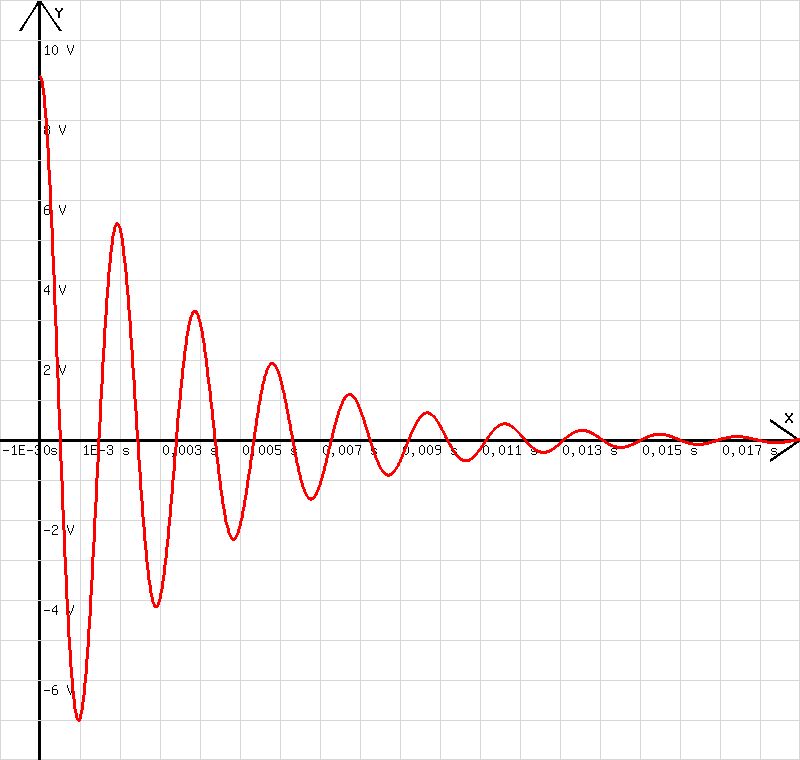Für R, C und L wurden die Werte des in Abb. 3 dargestellten Schwingkreises genommen. Die Anfangsladung Q ist 2,2 μF · 9V ≈ 0,00002 C.