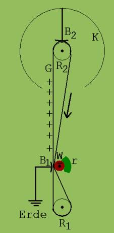 Die Influenz wird in einer als Bandgenerator bekannten Elektrisiermaschine genutzt. Abb. 3 zeigt den Aufbau dieses Generators. Ein zwischen den beiden Rollen R1 und R2 umlaufendes Gummiband G treibt eine PVC-Walze W an. Diese reibt an einem Reibzeug r und erhält dadurch eine negative Ladung. Unter der Einwirkung dieser geladenen Walze fließt von der Oberfläche des Bandes negative Ladung über den Bügel B1 zur Erde ab. Infolgedessen wird das Band G positiv aufgeladen. Auf dem laufenden Gummiband G werden positive Ladungen in die Kugel K transportiert. Dort fließen sie unter den Abstoßungskräften zwischen gleichartigen Ladungen über den Bügel B2 auf die Oberfläche von K. Die Kugel wird solange aufgeladen, bis Ladungen mit Funkenbildung die Oberfläche von K verlassen.