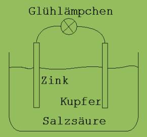 Aus den Erkenntnissen in 3.1.3 ergibt sich eine wichtige Folgerung: Es ist bekannt, dass das Metall Zink im Gegensatz zu Kupfer schnell von einer Säure z.B. Salzsäure aufgelöst wird. Die von der Oberfläche des Zinks abgelösten Atome nehmen ihre positiven Ladungen mit. Demnach ist ein Überschuss an negativer Ladung auf dem Zink zu erwarten. Man kann ihn nach Abb. 1 über eine Kupferelektrode der positiv geladenen Säure zuführen. Schaltet man in die metallische Verbindung der beiden Platten ein Glühlämpchen, dann leuchtet dieses, womit die Vermutung bestätigt wird.