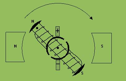 Die hier beschriebene Tatsache ermöglicht den Bau des in Abb.3 skizzierten Elektromotors. Ein Elektromagnet (Eisenstab mit einer Leiterwicklung), an dem zwei Halbringe (sie bilden einen Kommutator) befestigt sind, rotiert um seine Mitte zwischen den Polen eines festen Magneten. Der elektrische Strom fließt von einem - Schleifkontakt (Graphit) zu einem Halbring, von dort aus in die Spule und danach aus der Spule über den zweiten Halbring zum + Schleifkontakt. Erreicht der Elektromagnet eine waagrechte Lage, dann verharrt er wegen seiner Trägheit nicht in dieser, sondern dreht sich darüber hinaus, was zu einer Umkehrung der Stromrichtung und damit zu einer Änderung seiner Polarität führt. Er erfährt somit Kräfte, die eine Fortführung der Rotation veranlassen.