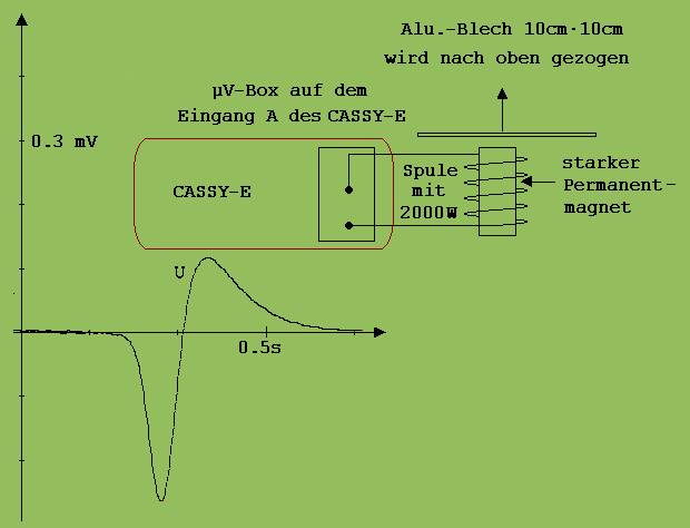 In der Abb. 1 ist eine Spule ( 2000 Windungen ) mit einem starken Magneten zu sehen. Über dieser Spule wird zunächst ein Aluminiumblech gehalten. Wird dieses Blech schnell nach oben gezogen, dann ist eine Spannung in der Spule nachweisbar (siehe Diagramm).