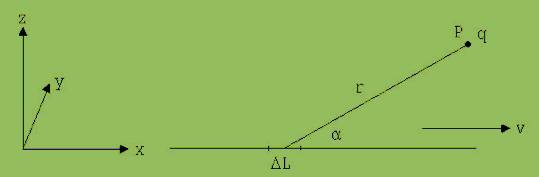 In der Abb. 1 ist ein solches Leiterstück abgebildet. Der erwähnte Punkt P hat den Abstand r von ΔL . Die Verbindungsstrecke zwischen P und ΔL bildet mit letzterem den Winkel α. Bei P ist eine Ladung q , die sich mit der Geschwindigkeit v parallel zum Leiter bewegt. q erzeugt bei ΔL ein B nach By = -v/c2 · Ez.