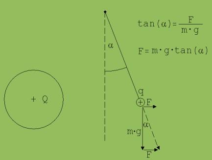 Eine kleine, mit + q positive geladene Kugel K der Masse m wird an einem nicht leitenden Faden aufgehängt. Das um eine Kugel mit der Ladung +Q herrschenden Feld dreht diesen Faden um den Winkel α aus der Lotrichtung. Die Skizze macht verständlich, dass für die Kraft F des Feldes am Ort der Kugel K gilt: