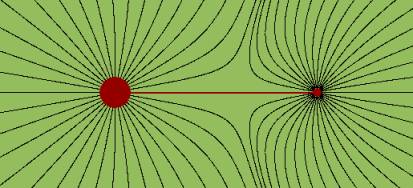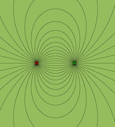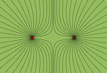 2. Feld um zwei geladene Kugeln mit den Ladungen + Q Das Feld verhält sich so, als ob quer zu den Kraftlinien ein Druck bestünde. |