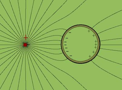 Zur Behandlung dieser Frage muss auf folgende Tatsache hingewiesen werden: Setzt man um K eine konzentrische Hohlkugel, deren Oberfläche fast den Punkt P erreicht und stellt zwischen dieser Hohlkugel und K eine leitende Verbindung her, so dass die Ladung von K auf die Hohlkugel übergehen kann, dann ändert sich die Feldstärke bei P nicht. Das Innere der Hohlkugel ist ohne elektrisches Feld. Ein geladener Ausschnitt aus der Oberfläche der Hohlkugel ähnelt mit seinen Kraftlinien einer positiv geladenen Platte, welche parallel zu einer negativ geladenen Platte (geladenes Plattenpaar) angeordnet ist Diese Tatsache veranlasst uns zu dem Schluss: