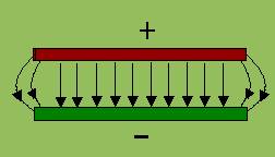 6. Feld zwischen zwei geladenen, parallelen Platten mit den Ladungen + Q und –Q Stellt man dieses Feld mit Grießkörnern dar, dann bilden sich im mittleren Bereich unter Einwirkung des Feldes bei anfänglich gleichmäßiger Körnerverteilung keine Anhäufungen. Das Feld ist demnach im mittleren Bereich nicht nur in Bezug auf seine Richtung, sondern auch noch in Bezug auf seine Stärke konstant. Man spricht von einem homogenen Feld. |