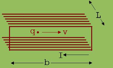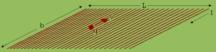 Es muss daran erinnert werden, dass ein stromdurchflossener Leiter für einen Beobachter B’ elektrisch geladen ist, wenn dieser sich parallel zum Leiter bewegt. Viele lange, eng nebeneinander liegende, parallele Leiter der Länge b, die entlang einer großen Strecke L aufgereiht sind, verhalten sich aus seiner Sicht wie eine geladene Platte , wenn sie alle vom gleichen Strom der Stärke I durchflossen werden (siehe Abb. 1).