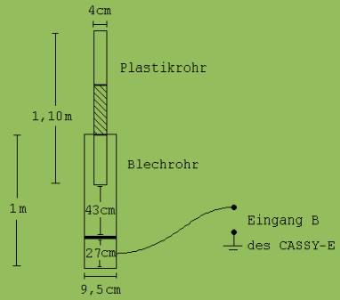 Ein Blechrohr als Sensor zur Aufnahme eines t-s-Diagramms zur Fallbewegung eines Plastikrohrs Eine Messmethode, die auf einem bekannten Effekt beruht, der aus der Sicht eines Schülers nicht für eine Messung in Betracht gezogen wird, findet in der Regel viel Interesse im Schulunterricht. Ein Beispiel hierfür ist das in Abb. 1 angedeutete Verfahren zur Aufnahme eines t-s-Diagramms. Ein Plastikrohr wird zunächst durch gleichmäßiges Reiben mit einem Stück Papier elektrisch aufgeladen (eine starke Ladung ist nicht erwünscht ). Dieses Rohr lässt man in einem Blechrohr ( verzinktes Regenabflussrohr ) fallen, wobei aus dem Blechrohr negative Ladung verdrängt wird (Influenz), deren Menge dem Fallweg proportional ist. Die abfließende Ladung (Integral der Spannung/R ) wird mit Hilfe eines AD-Wandlers (CASSY) gemessen. Die 43 cm lange Fallstrecke beginnt im Blechrohr 30 cm unterhalb der oberen Rohröffnung . In diesem Fall wirkt sich das inhomogene elektrische Feld am Anfang des Stabes nicht in unerwünschter Weise auf den Verlauf des Diagramms aus. Einstellung des Programms „MAuS“ für das CASSY-E: ± 0,3V, Integral, Zeigerempfindlichkeit 8, Meßzeit 4 s, Diagramm nach Messung, Polarität: - . Aus dem mit 4s Messzeit aufgenommene Diagramm wird der zum Fall gehörende Teil mit dem Unterprogramm „Koordinaten-Kurve erneut zeichnen oder Meßdiagramm dehnen" vergrößert. Es entsteht das Diagramm in Abb. 2. Bevor das in Abb. 2 sichtbare Koordinatensystem gesetzt werden kann, muss das Bildfeld passend kalibriert werden. Nach Anklicken von „Koordinaten -Kalibrieren in y-Richtung" wird der Scheitel und die zum Aufschlag gehörende Stelle des Diagramms angeklickt. Nach der Frage über den zugehörenden Unterschied der y-Werte wird 43 cm angegeben.