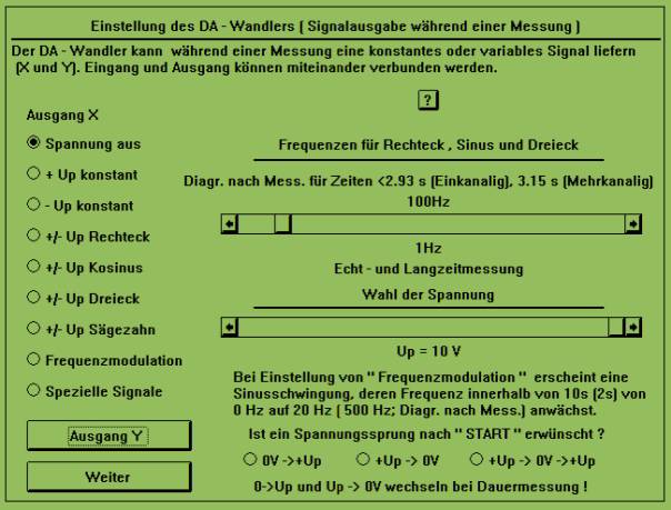 Das Cassy - E kann in Verbindung mit dem Programm MAuS als Signalgenerator eingesetzt werden. Die Auswahl der Signale für die Ausgänge X und Y geschieht mit dem in Abb. 1 sichtbaren Dialogfeld. An ihm ist erkennbar, dass man z.B. Töne mit verschiedenen Tonhöhen erzeugen kann. Die Frequenz eines Signals kann so genau eingestellt werden, dass damit beeindruckende Resonanzversuche möglich sind. Wenn ein Lautsprecher ein vom CASSY kommendes 440 Hz - Signal ( einer Stimmgabel angepasst ) kurzzeitig aussendet, dann tönt anschließend eine ca. 7 m vom Lautsprecher entfernte 440 Hz - Stimmgabel ( Leybold ) deutlich hörbar zurück. Die Signalausgabe erfolgt immer während einer Messung (Diagramm nach Messung !). Hierbei kann man den Eingang mit dem Ausgang verbinden und somit die Ausgangsspannung registrieren.