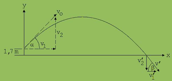 → 0 = - ½ · g · t2 + t· v0 · sin α + y0 (quadratische Gleichung für t ); t1 = - 0,15 s (unpassend) ; t2 = 2,3 s