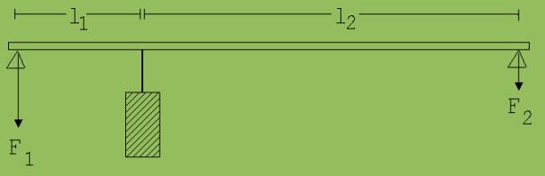 F1 = F · l2 / (l1 + l2); F2 = F · l1 / (l1 + l2)
