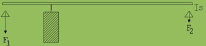 An einer Stange, die mit beiden Enden aufliegt, hängt ein Gewicht mit der Gewichtskraft F. l1 und l2 sind die Abstände des Aufhängepunktes von den Auflagepunkten der Stange.