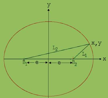 L1 = [(x-e)2 + y2 ] ½ ; L2 = [(x+e)2 + y2 ] ½ → [(x-e)2 + y2 ] ½ + [(x+e)2 + y2 ] ½ = Konstante