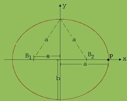 Der Ellipse wird ein Koordinatensystem zugeordnet. Die x –Achse läuft durch die beiden Brennpunkte, die y-Achse halbiert die Verbindungsstrecke der Brennpunkte rechtwinklig. Die halbe Abstand der Brennpunkte von einander wird Exzentrizität e genannt. Mit a und b werden die halben Ellipsendurchmesser auf der x- und y-Achse bezeichnet.