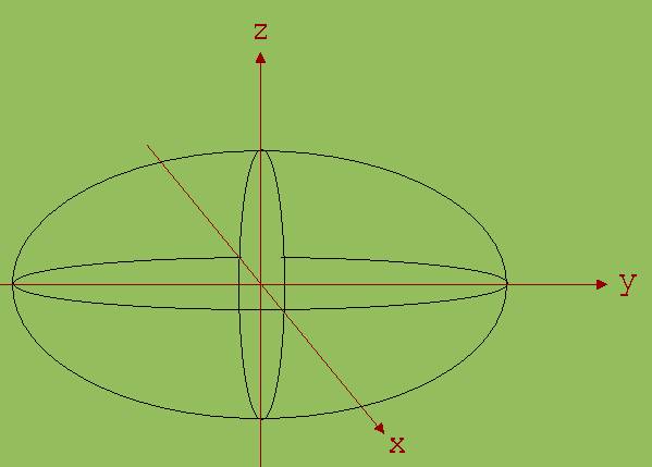 Es liegt nahe, die Ellipsengleichung mit dem Term z2 / c2 zu ergänzen. Alle Punkte, deren Koordinaten die Gleichung x2 / a2 + y2 / b2 + z2 / c2 = 1 erfüllen, bilden ein Ellipsoid (siehe Abb. 3).