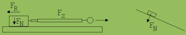 Es stellt sich heraus, dass die Reibungskraft nicht von der Geschwindigkeit und der Größe der Reibflächen abhängig ist. Neben der Rauigkeit der Reibflächen ist nur noch die Kraft von entscheidender Bedeutung, mit der das Klötzchen auf seine Unterlage drückt. Diese Kraft trägt den Namen Normalkraft FN. Wenn das Klötzchen auf einer waagrechten Fläche liegt, dann gleicht FN seiner Gewichtskraft.
