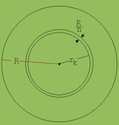 Zur Berechnung des Trägheitsmoments J denken wir uns den Zylinder mit dem Radius R, der Masse m und der Breite B in n konzentrische, dünnwandige Hohlzylinder mit den Radien rk und den Wanddicken d = R/n eingeteilt (Bsp.: n = 500).
