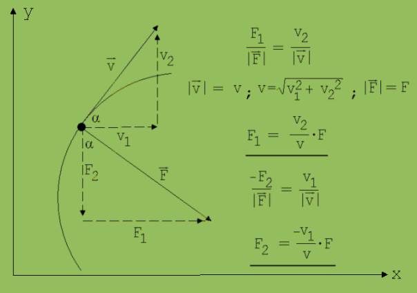 Nach dieser Rechnung ist der Ort und die Geschwindigkeit zu Beginn des zweiten Abschnitts h bekannt. Mit diesen Werten wird daraufhin der Ort und die Geschwindigkeit zu Beginn des dritten Abschnitts berechnet usw. Die Koordinaten F1 und F2 der Kraft F (|F| = F) werden wie folgt bestimmt: