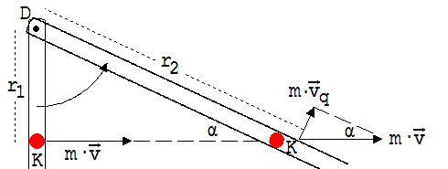 Wir lassen eine Kugel K in Gedanken reibungsfrei in einer sehr leichten, dünnwandigen Röhre gleiten, die sich um eine senkrechte Achse D reibungsfrei drehen kann (siehe Abb.3). Die Kugel bewegt sich nach dem Trägheitssatz gleichförmig und führt hierbei die Röhre mit sich, deren Masse vernachlässigbar klein ist.
