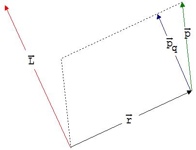 Unter dem Drehimpuls L von p verstehen wird das Produkt mit dem Betrag |r| ·|pq|. pq ist die Komponente von p senkrecht zu r in der von r und p aufgespannten Ebene (siehe Abb. 4). L hat im Fall einer Linksdrehung ein positives und andernfalls ein negatives Vorzeichen.