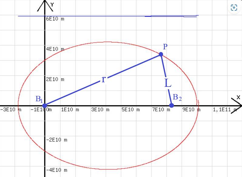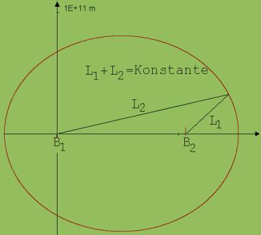 Neben der Planetenbahn wird eine waagrechte Strecke angezeigt. Es ist das Diagramm zu w=(r+L)/2 = (r+wrz(y^2+(x-8,3E10)^2))/2, dessen waagrechter Verlauf die Richtigkeit des ersten Keplerschen Gesetzes anzeigt. 8,3E10 m ist der Abstand des zweiten Brennpunkts B2 vom Nullpunkt des Koordinatensystems. B1 und B2 sind von der Mitte der Ellipse gleich weit entfernt.